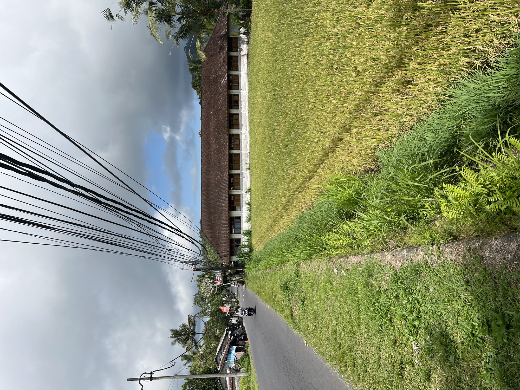 The image depicts a street scene in Selat, Indonesia. The camera faces a two-lane asphalt road with a grassy verge on one side and a rice paddy field on the other. The field is a mix of green and golden hues, suggesting a crop near harvest. A long, two-story building with a brown tiled roof and a series of windows runs parallel to the road on the field side. A tangle of overhead power lines dominates the sky above the road, obscuring a partly cloudy sky. Several motorcycles are on the road, including one that appears to be in motion. Buildings and foliage line the opposite side of the road, with palm trees visible amidst other vegetation. The overall impression is of a rural street scene with a mix of natural and man-made elements.