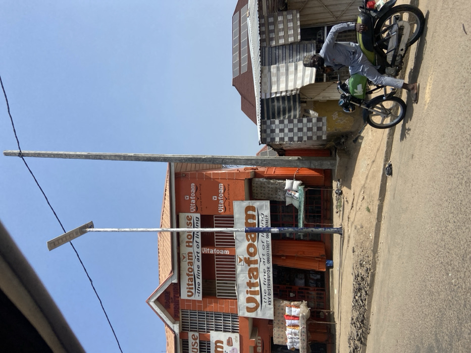 This image presents a street scene in Sardauna, Nigeria, captured under a clear blue sky. The central focus is a two-story commercial building with an orange facade and a terracotta-tiled roof, identified as "Vitafoam House - the fine art of living." Multiple "Vitafoam" branded signs are affixed to the building, including a large banner above the ground-level entrance that displays "KEY DISTRIBUTOR" and two partial phone numbers (08033133077 and 080974419). Merchandise, including mattresses and foam products, is displayed on tables outside the storefront. To the immediate right of Vitafoam House, a smaller, single-story structure with a corrugated metal roof is visible. Several patterned fabrics or mats are draped and displayed across its front. Behind this smaller building, another structure with a reddish-brown tiled roof is topped with multiple solar panels. In the foreground, on a dirt shoulder alongside a paved road, a male individual is seated astride a green motorcycle. He wears a light-colored, long-sleeved garment and a skullcap, looking towards the left of the frame. His left hand rests on the motorcycle's handlebars. Loose gravel and dirt are present on the ground. Two tall utility poles punctuate the scene; the pole on the left features a solar-powered street light fixture, while the pole to the right, a bare concrete or wooden structure, has a black cable stretched horizontally across the upper portion of the frame.