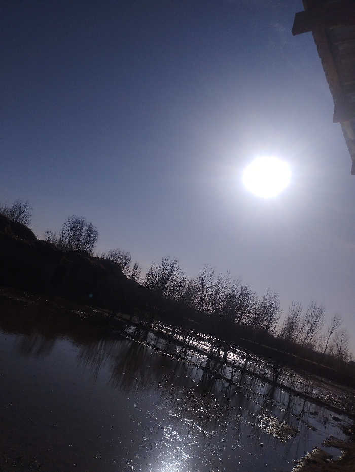 The image depicts an outdoor scene in Jappas, Uzbekistan, under direct sunlight. The upper portion of the frame is a clear, light blue sky. The sun, a bright white orb with lens flare, is prominently positioned in the upper right quadrant. The lower half of the image features a dark, reflective body of water, likely a pond or flooded ground, which mirrors the sun's glare, creating a bright reflection in the lower left. Along the horizon, a dark, silhouetted landmass rises on the left, transitioning into a dense line of bare deciduous trees extending across the frame. A fence-like structure or row of posts is discernible within or behind the tree line and is also reflected in the water. A dark, angular structural element, possibly part of a building, is partially visible in the extreme upper right corner. No individuals or discernible actions are present.
