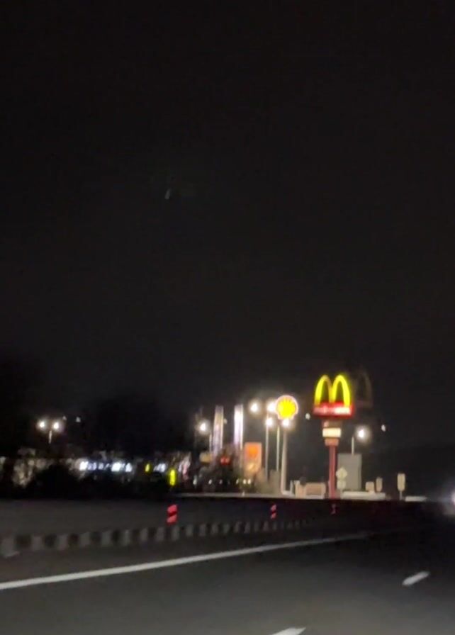 roadside rest stop at night, filmed from the perspective of a vehicle driving on the highway
