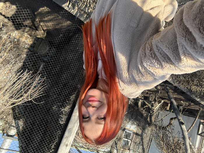 The image depicts an outdoor selfie of a smiling female in Shakhty, Russia. She has long, bright orange-red hair, light-colored eyes, and a small ring piercing her right nostril, looking directly into the camera. She is wearing a light beige, textured hooded jacket, with her left arm extended to hold the camera. The background features a wire mesh fence, behind which numerous bare, dry tree branches are visible. Further in the background, a dilapidated white building with visible windows and apparent structural damage stands. A vertical wooden post is also present in the background, near the fence. The scene is brightly illuminated by sunlight, casting discernible shadows.