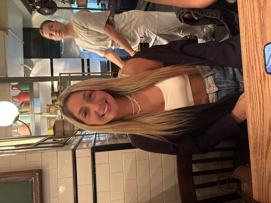 The image depicts an indoor scene within what appears to be a restaurant or café. In the foreground, a young adult female with long, straight blonde hair and light skin is seated at a light-colored wooden table, smiling directly at the camera. She is wearing a white crop top, blue denim jeans, and a dark blazer draped over her shoulders. She wears two layered necklaces: one a white beaded choker and the other a silver-toned chain with small circular or floral motifs. To her left, partially visible on the chair, is a small brown Miu Miu branded bag. A smartphone is positioned on the table in the lower right corner, screen facing up. In the mid-ground, to the right and slightly behind the seated woman, stands another young adult female with dark hair pulled back. She is wearing a light grey t-shirt and a white apron, indicative of staff attire. She is looking towards the right side of the frame, away from the camera. The background features a wall on the left adorned with white subway tiles and black horizontal trim. A dark-framed object, possibly a menu board, is partially visible in the upper left. Further back, on the right side of the image, is a commercial kitchen or service area with shelving displaying various colorful bottles and vessels. Hanging kitchenware, such as dark pots, is also visible. An overhead spherical white light fixture is positioned on the left side, providing illumination. The specific location within Tel Aviv, Israel, is not discernible from the visual information provided in the image.