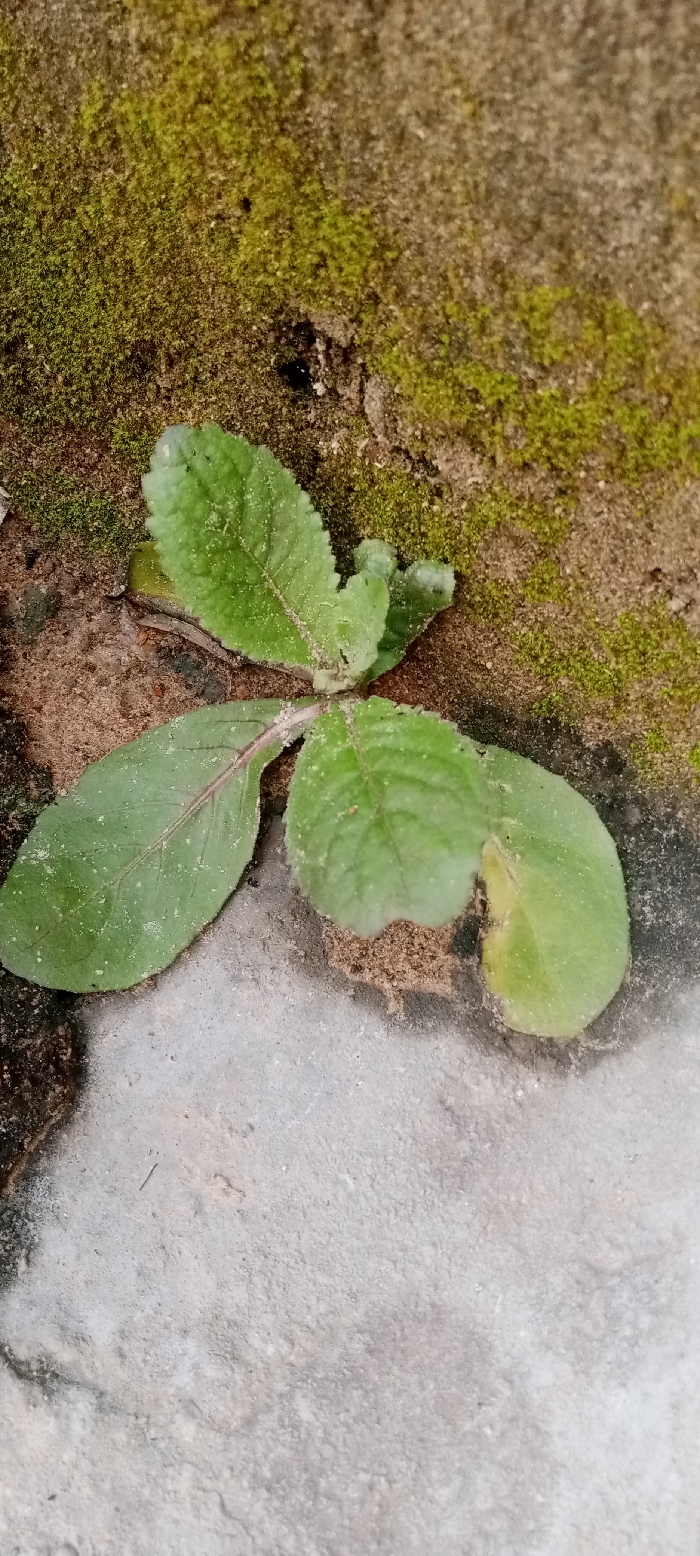 The scene depicts a small plant growing at the base of a moss-covered structure in Kwamba, Nigeria. The primary subject is a low-lying green plant, approximately 10-15 cm in diameter, with multiple broad, ovate leaves. These leaves are medium green, appearing slightly serrated along the edges, and are visibly dusted with fine, light-colored particulate matter. One prominent leaf on the left exhibits a reddish-purple tint along its central vein and underside. The plant is rooted in a dark brown, granular substrate, consistent with soil or dirt, situated in a natural crevice or transition zone. This substrate occupies the middle ground of the image. Above and to the right of the plant, a rough, uneven surface, likely a wall or embankment, is extensively covered with patches of vibrant green moss, indicating moisture. The underlying material of this surface appears to be a brownish-grey, coarse-textured concrete or stone. The foreground consists of a flat, light grey, weathered concrete surface, which is also lightly dusted with particulate matter. This surface meets the soil/dirt area where the plant is established. No people or animals are present. The scene is static, captured under what appears to be diffused natural light.