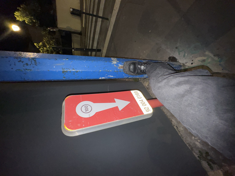 - "The image depicts a nighttime urban scene, focused on a person's lower left leg and foot alongside a red sign and a blue pole" by FM-Q2t9f1, licensed under CC BY 4.0