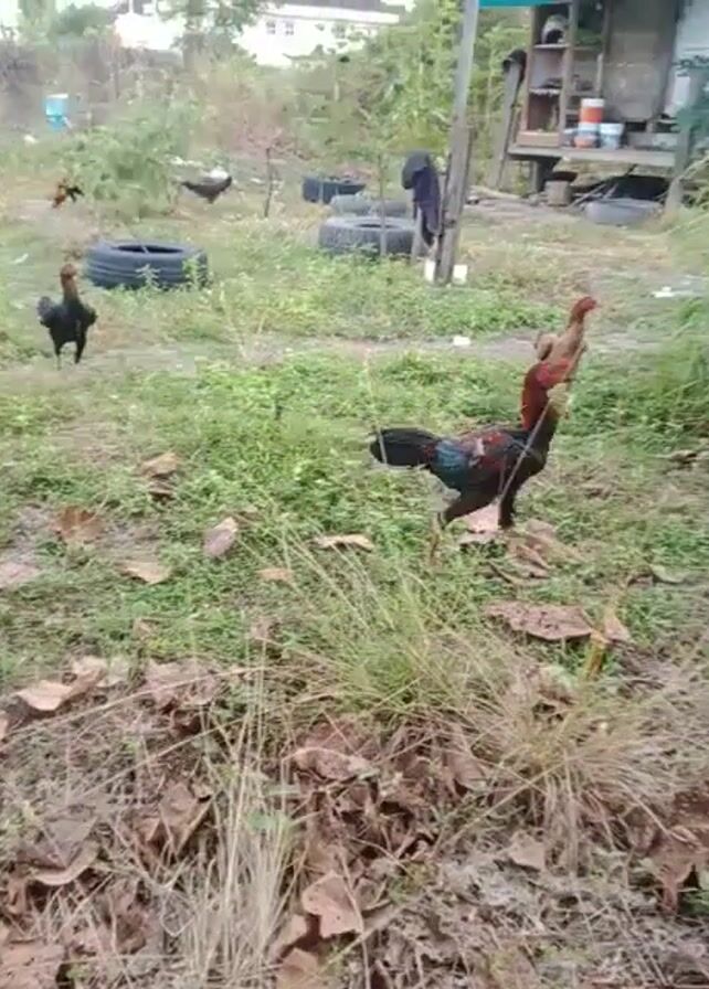 grassy yard with several chickens, including at least two roosters. The chickens are walking around and pecking at the ground. The yard also has some tires and other objects scattered around. There is a building visible in the background.