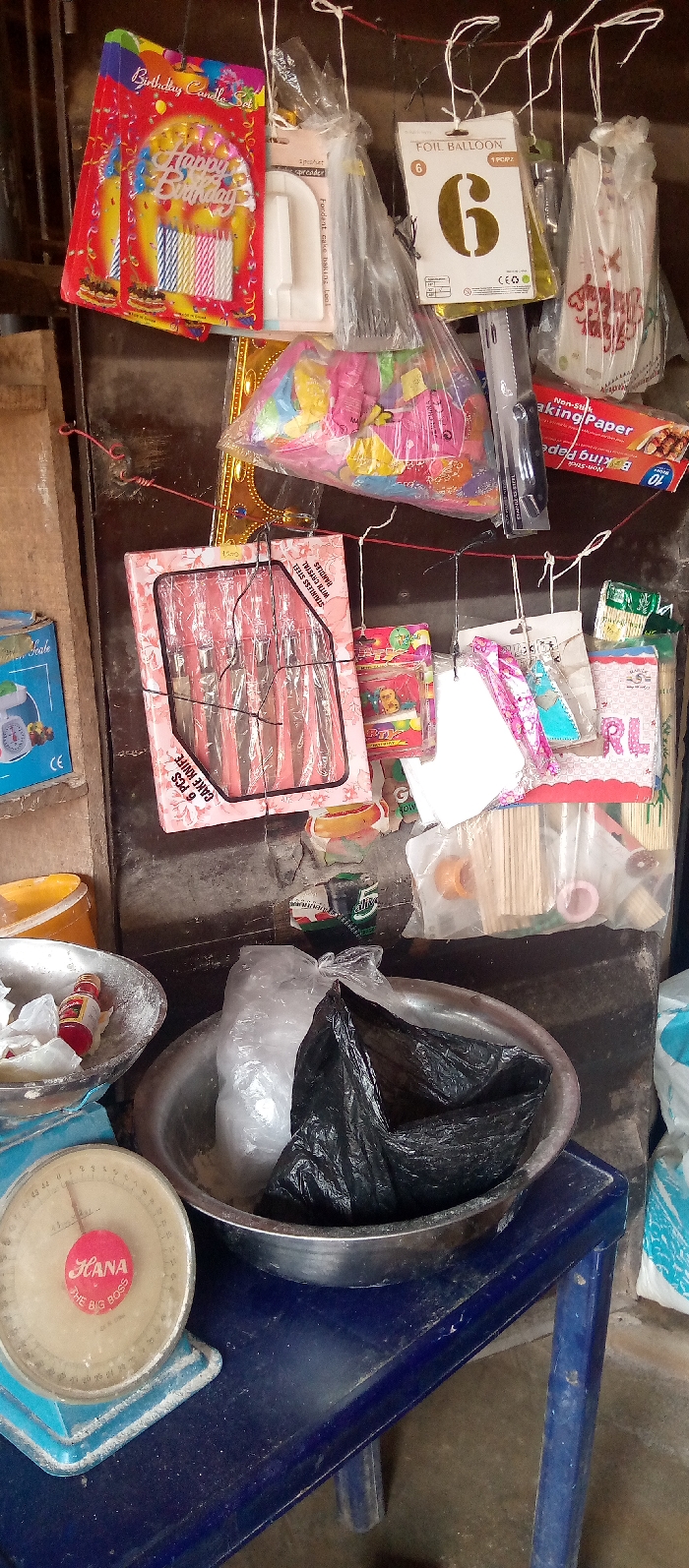 This image displays the interior of a retail stall or shop, located in Nsugbe, Nigeria, primarily offering baking and party supplies