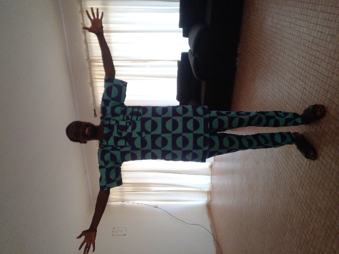 A single male individual is depicted standing centrally in an indoor room in Narayi, Nigeria. He has dark skin and an open-mouthed smile, looking directly forward. He wears a two-piece garment consisting of a short-sleeved top and trousers, patterned with alternating teal and dark purple squares, each containing a semi-circular design. His arms are outstretched horizontally with open palms and splayed fingers. He wears dark, open-toed sandals. The room features a light brown tiled floor, plain white walls, and a white ceiling. A dark electrical cord runs vertically down the left wall. In the background, to the right, are floor-to-ceiling sheer white curtains, behind which a dark-colored sofa is partially visible. The room is brightly illuminated.