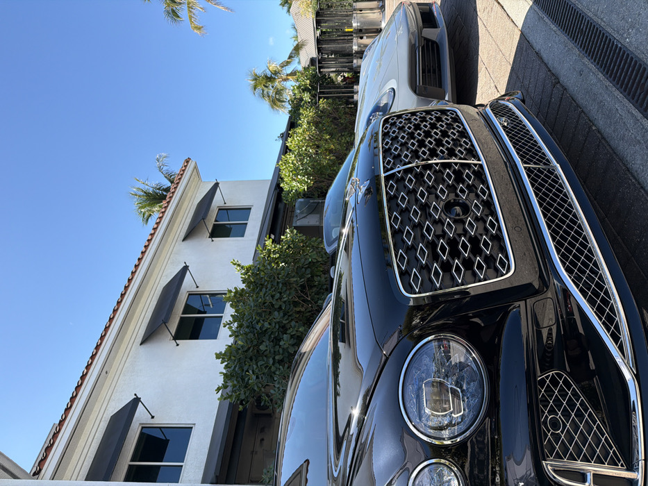 The image depicts an outdoor, sunny daytime scene in Naples, Florida, United States. In the foreground, a black Bentley luxury sedan is prominently featured, displaying its chrome matrix grille with a diamond pattern, circular LED headlights, and lower chrome mesh grille. Its hood carries the Bentley "flying B" emblem. Partially visible behind and to the right of the Bentley is a grey Porsche 911 convertible, identifiable by its distinct front bumper and headlights, with its soft-top appearing folded down. The vehicles are parked on a light-colored paved surface, which includes a storm drain grate in the lower right. The background features a two-story building with a white stucco facade and a terracotta-tiled roof line. Three upper-story windows, each with a dark frame, are equipped with black retractable awnings. Dense green bushes are positioned along the base of the building. The sky is clear and blue, and several green palm trees are visible in the mid-ground and background, consistent with a warm climate. No people or animals are present, and no discernible actions or interactions are occurring.