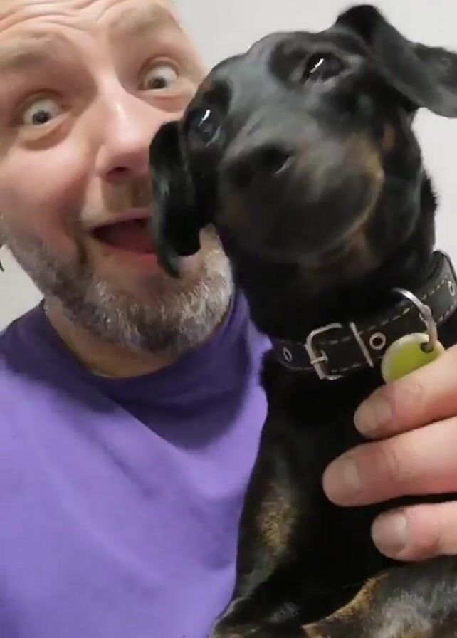 A medium shot shows a light-skinned man with a beard holding a small black and brown dog. The man, wearing a purple t-shirt, is looking into the camera with a wide-eyed, excited expression and his mouth open. He has a shaved head, and small hoop earrings are visible in his left ear. The dog, wearing a black collar with a silver buckle and a light green tag, is looking off to the side. The dog then turns to lick the man's face. The background is a plain white wall.