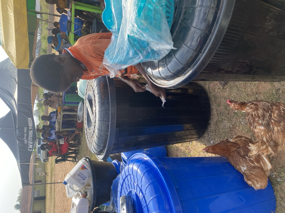 The image displays an outdoor scene in Itobe, Nigeria, specifically at the CWO Itobe Parish, indicated by a banner on a black tent. In the immediate foreground, a young male, appearing to be a child, with dark skin and an orange collared shirt, stands facing downwards, handling small clear plastic packets with both hands between two large black plastic bins. To his left, a large blue plastic bin with a lid is visible, along with another black bin filled with white plastic containers. On top of the black bin to the child's right, a light blue plastic basket covered in clear plastic is present. Two brown hens stand on the dry, light-colored dirt ground in the lower-left portion of the frame. In the midground, under a black tent and a yellow tent, multiple adults are seated on black plastic chairs at green plastic tables. A woman in a red dress is visible under the black tent, and trays of eggs are discernable on tables. In the background, a white SUV is parked near a building, and several individuals are walking across an open, dusty field under a clear sky.