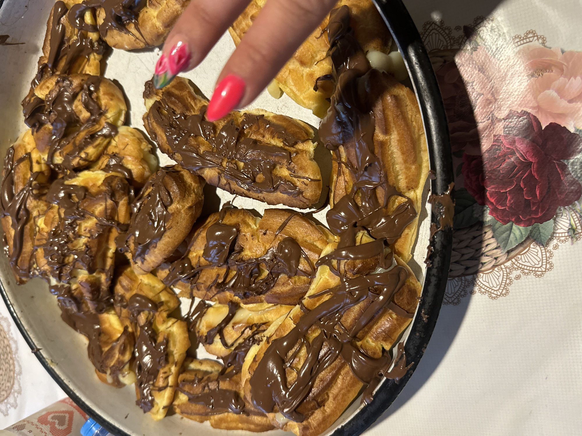 A top-down, close-up shot depicts a metal tray filled with cream puffs drizzled with chocolate. A hand with bright pink and floral-patterned nails reaches toward the pastries. The tray rests on a floral-patterned tablecloth with a lace edge. The location is Skala, Bulgaria.