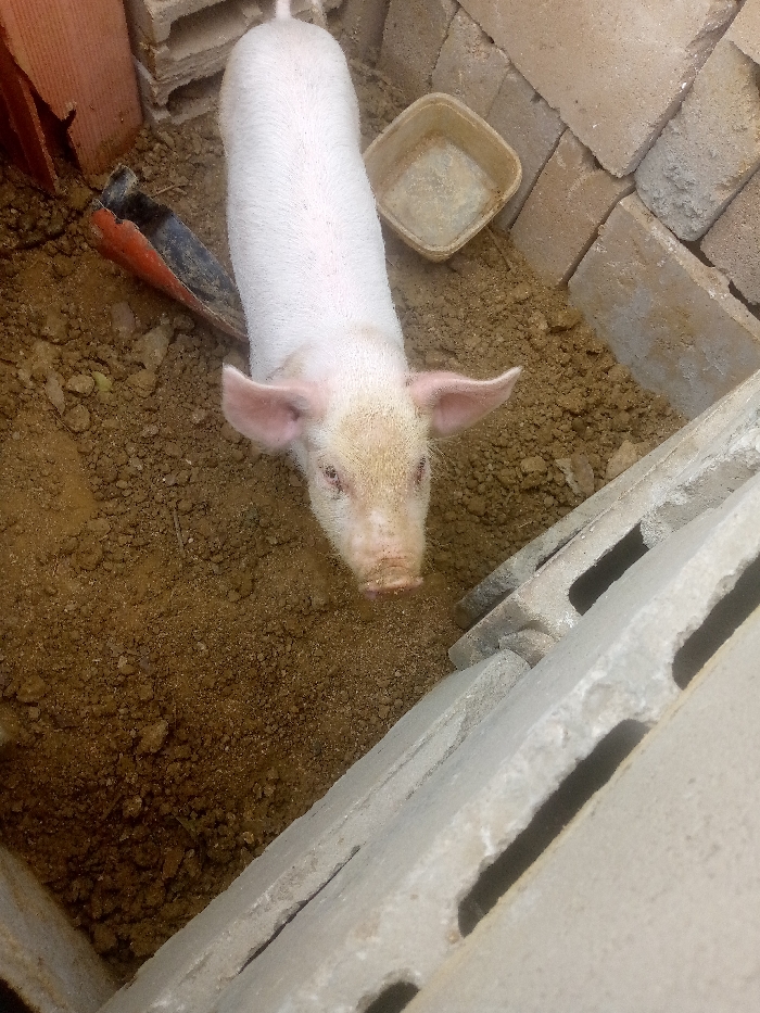 - "An overhead shot captures a small, light pink pig standing on dirt within a confined space" by FM-Q5qB73, licensed under CC BY 4.0
