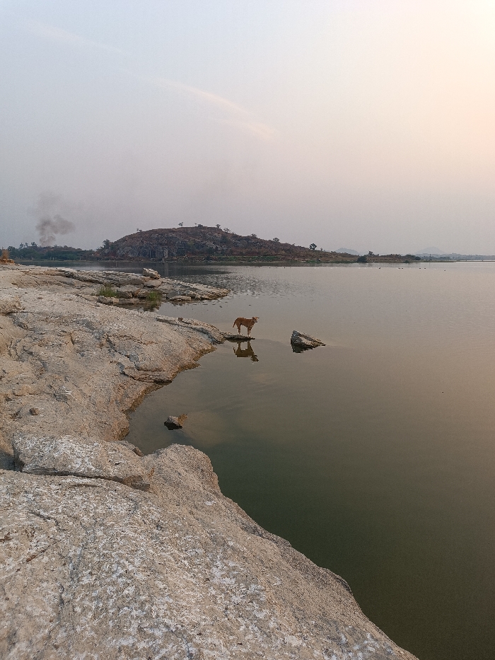 The image depicts a tranquil, hazy landscape in Kammavaripalli, India, focusing on a rocky shoreline and a large body of still water under a pale sky. In the foreground and extending to the mid-left, a light-colored, heavily textured rock formation constitutes the immediate shoreline. A reddish-brown, medium-sized dog stands on a partially submerged rock platform within the water, near the shore, positioned in the middle-left of the frame. Its reflection is clearly visible in the calm water. To the dog's right, a larger, irregularly shaped rock protrudes from the water. The water surface, reflecting the sky and objects, occupies the majority of the right and central portions of the image. Across the water, in the background, a large, dark, undulating hill or mound is visible, sparsely dotted with vegetation. To the far left, a plume of dark smoke rises from behind the distant land features. The sky is largely overcast with a uniform light grey hue, showing a slight orange tint on the far right horizon, indicative of either dawn or dusk.
