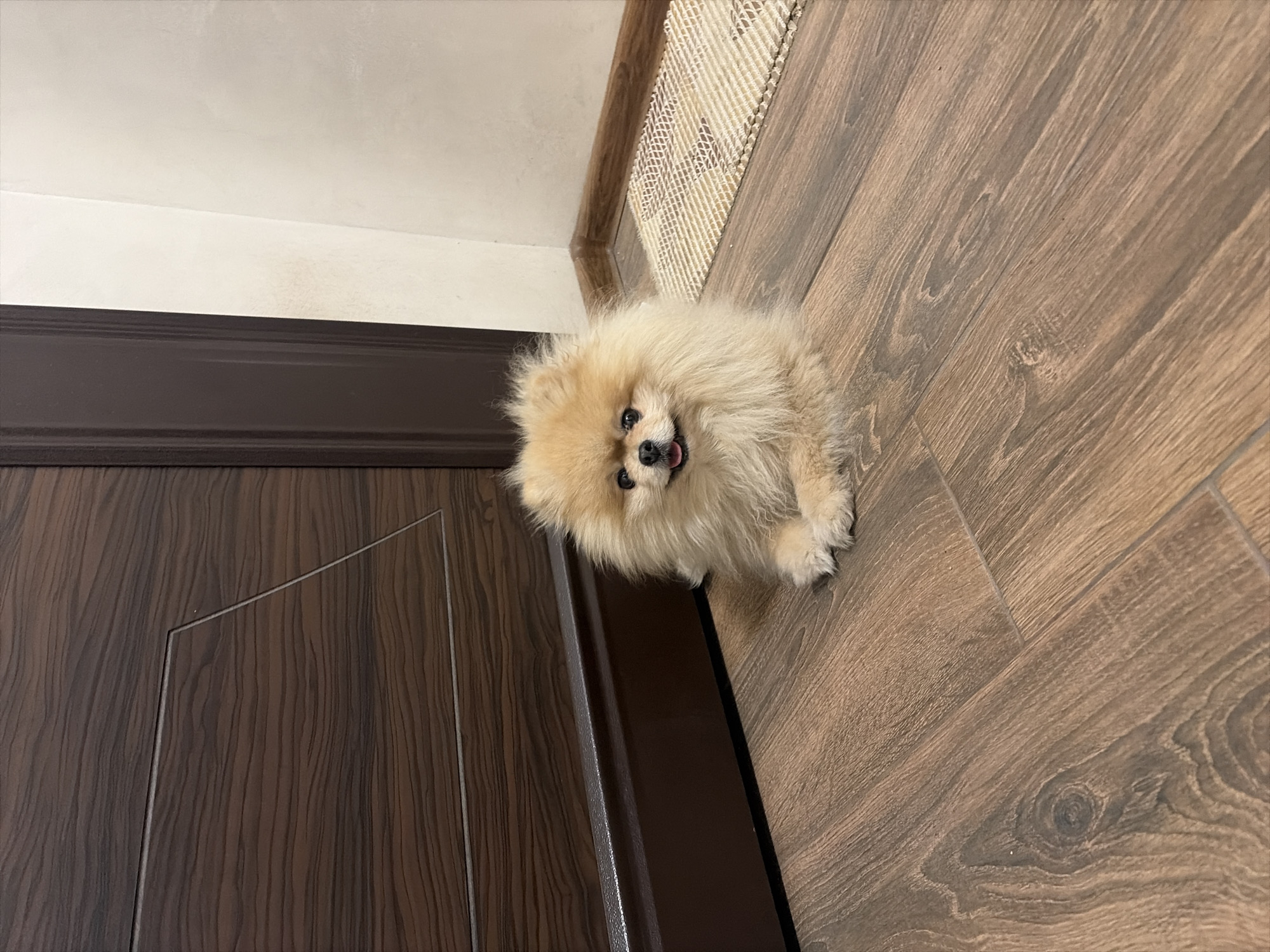 - "An interior scene in the City of Elin Pelin, Bulgaria, depicts a single Pomeranian dog positioned centrally, lying on a medium-brown wood laminate floor" by FM-trz1g2, licensed under CC BY 4.0