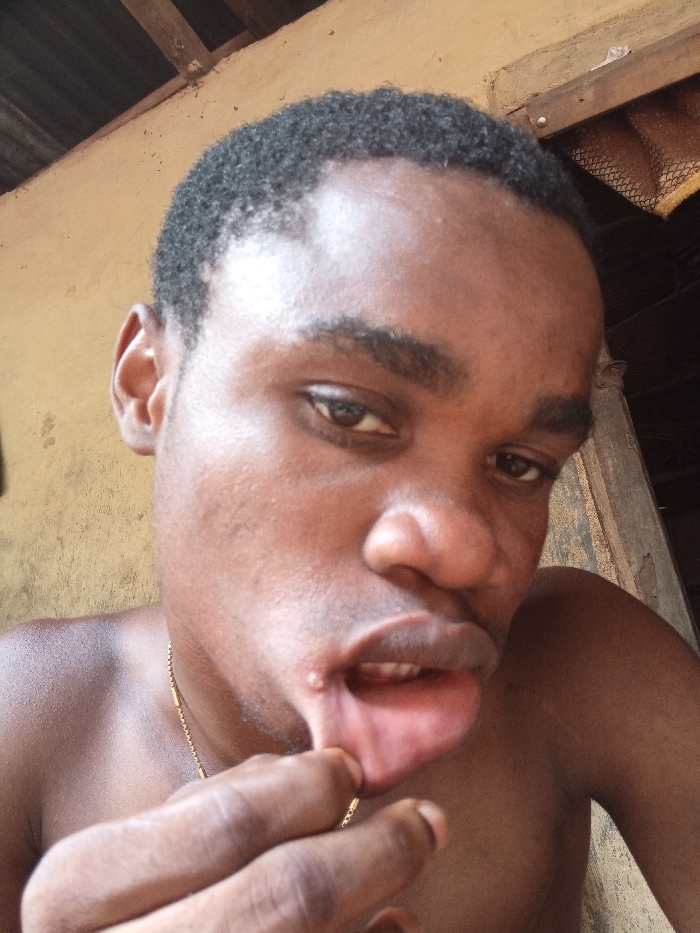 A close-up shot reveals a dark-skinned man with short, black hair and brown eyes. His lips are parted, exposing his teeth, and a small sore is visible on his lower lip. He is touching his lower lip with his fingers. A thin gold chain is visible around his neck. The background shows a wall and a partially visible wooden structure with a dark mesh. The image has warm lighting and a slightly grainy texture.