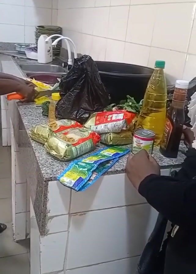 kitchen scene, possibly in a domestic or commercial setting. The camera moves around the countertop which is covered with food items and cooking supplies. There is a sink in the background with stacked dishes. The countertop has items such as bottles of oil and sauce, packages of food, and a can. People are preparing food, with one person chopping vegetables with a knife and another handling ingredients. A plate of cooked meat is seen. Scattered on the floor are wrappers and peels of ingredients.