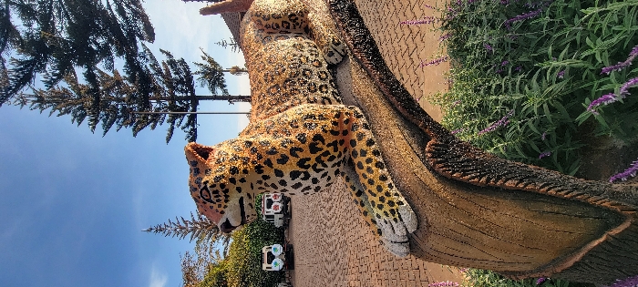 The image displays an outdoor scene in Rhotia, Tanzania. A prominent, life-sized mosaic statue of a leopard, constructed from colored tiles, occupies the foreground. The leopard statue, featuring black spots on a tan and orange coat with white paws and muzzle, is depicted in a reclining position, resting on a sculpted, textured brown tree branch. Its head is turned to the left, looking slightly upward. In the background to the left, a paved area of reddish-brown interlocking pavers is visible, where two white safari-style vehicles, identifiable as Land Cruisers with roof racks and rear-mounted spare tires, are parked. Dense green foliage forms a backdrop behind the vehicles. To the right and in the background, several tall, slender evergreen trees stand against a clear, bright blue sky with minimal cloud cover. A light pole is positioned among these trees. The immediate foreground contains a patch of green plants with purple flowering spikes. No individuals are present in the scene.