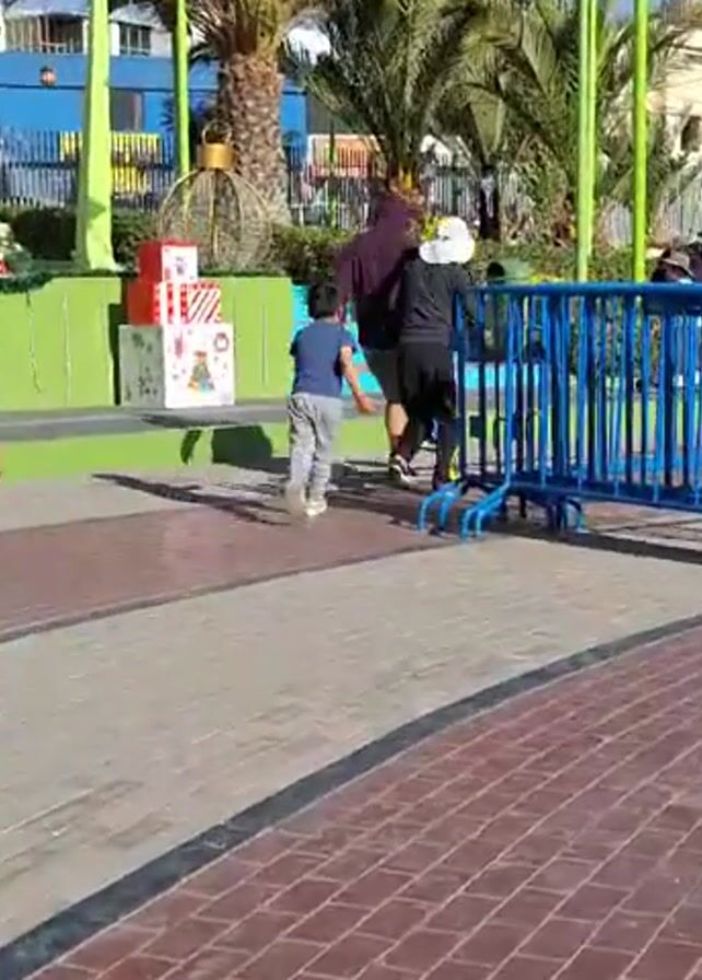 A bright, sunny day at a public park. In the foreground, a young boy in a green t-shirt and dark pants runs towards a group of three people. One person is wearing a purple hooded shirt, shorts, and dark shoes. Another person is wearing a white sun hat and dark clothing. A young boy in a blue shirt and grey pants is playing with a blue ball at their feet. A temporary blue metal barrier stands to the right of the group. Behind the group, a green fence decorated with Christmas decorations borders an elevated platform. Several decorative Christmas presents are visible on the platform. A palm tree and tall lamp posts are nearby. In the background, buildings of varying colors are seen. The ground is covered with a mixture of grey and red brick pavers.