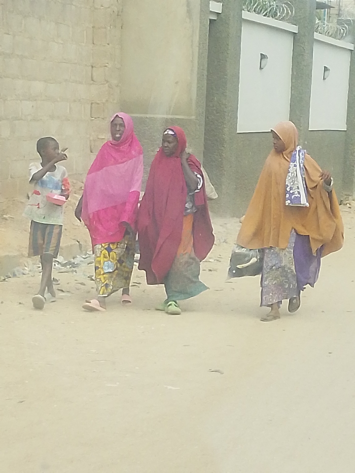 Four individuals walk along a dusty road. A young boy in a patterned shirt and shorts leads, pointing to the left. Three women follow, each wearing a head covering and long skirt. The first woman wears a pink head covering and a skirt with a floral pattern. The second has a red head covering. The third is draped in an orange garment and holds a patterned bag. A light-colored brick wall is to the left and a concrete structure is to the right.