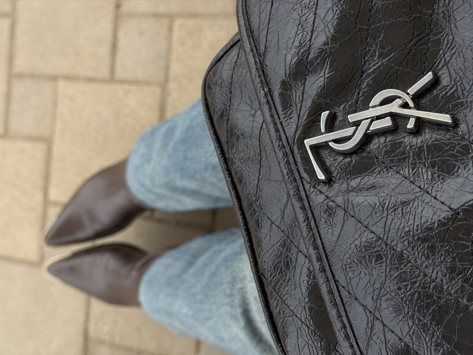 The image depicts a top-down perspective of an individual's lower body and a handbag, set against a background of paving stones in Beryozovy, Russia. The person is wearing dark brown, pointed-toe boots and light blue, acid-wash jeans. A dark gray or black quilted leather handbag, exhibiting a crinkled texture, is prominently positioned in the foreground. A silver-toned metallic YSL monogram logo is affixed to the front surface of the handbag. The ground consists of light beige rectangular paving stones arranged in a grid pattern.