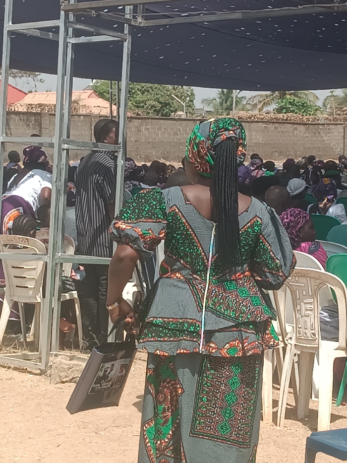 A woman with long, dark braids stands with her back facing the camera. She wears a gray and green patterned top and skirt, with a matching headwrap. She holds a black bag with a picture on it. The background shows a crowd of people sitting under a metal frame with a blue canopy. Plastic chairs are visible, and a brick wall is in the distance. The ground appears to be sandy.