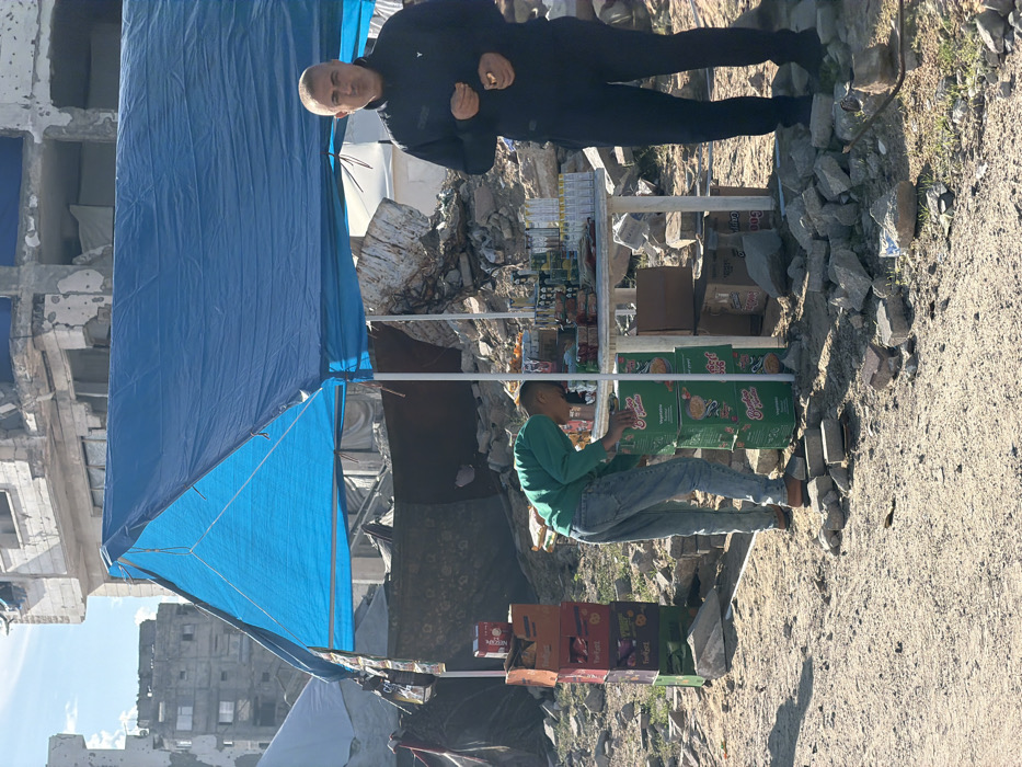 Two people stand near a makeshift food stand in front of a damaged building. The food stand has a blue tarp overhead for shade and is stocked with items like cereal, chips, and drinks. One person is in a black jacket and pants. The second person is wearing a green long-sleeved shirt and jeans. The surrounding area appears to be a mix of rubble and debris. The ground is uneven and rocky.