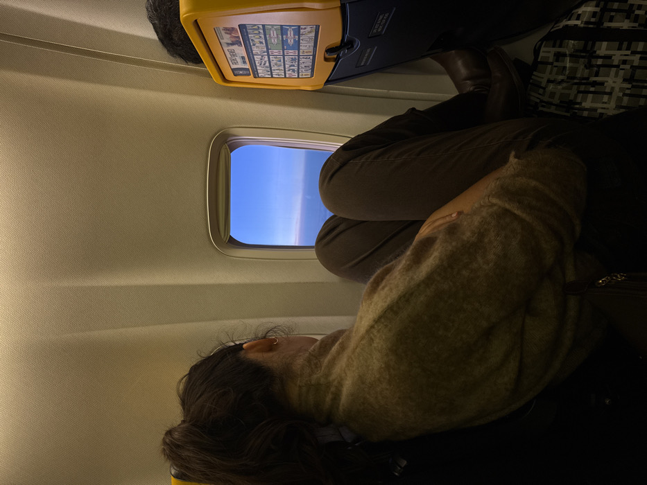 A person is resting their head by a window on an airplane. They are wearing a beige sweater, and their dark hair is visible. The window shows a bright blue sky. Their legs, clad in brown pants, are propped up against the seat in front. Above, a yellow panel displays safety instructions. Part of a dark bag is visible next to the person, suggesting they are traveling.