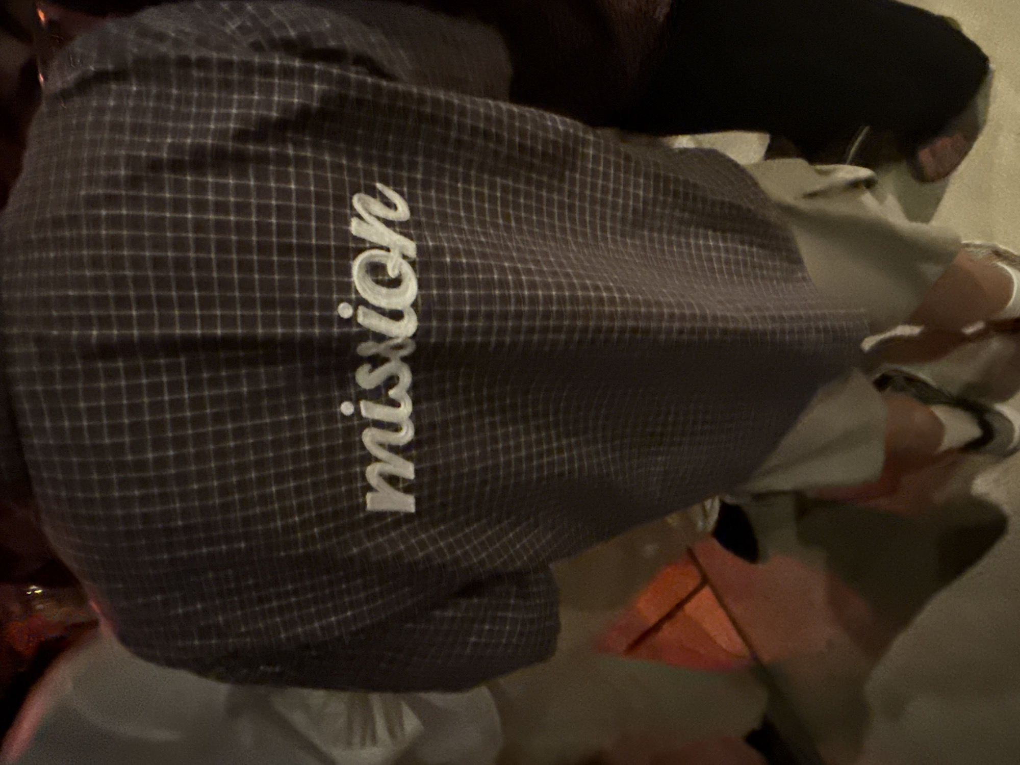- "The image presents a close-up view of a plaid patterned backpack with the word "mission" printed vertically in white letters on its side" by FM-l9epk1, licensed under CC BY 4.0