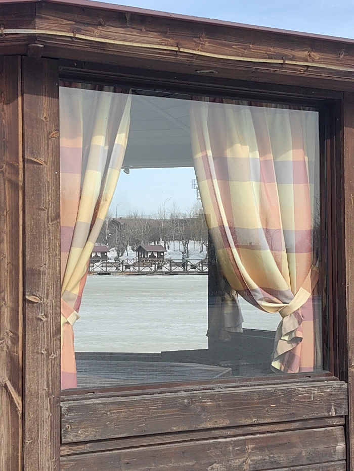 The image presents a view through a window of a dark brown wooden building, located within Vidnoye City Park, Vidnoye, Russia, specifically overlooking Bolshoy Vidnovsky Prud (Vidnoye Lake). The scene is set during winter. The foreground is dominated by the dark brown, weathered wooden frame and siding of the building. A large, clear glass window pane is centered, with two plaid curtains drawn back and tied on either side. These curtains exhibit a pattern of yellow, orange, and reddish-purple squares. The window glass reflects a white interior ceiling and possibly a light fixture. Beyond the window, the midground features a large expanse of frozen water, appearing as white and light gray ice. Along the far edge of this frozen body of water, a dark wooden boardwalk or pier structure is visible. Several small, open-sided gazebos with dark roofs and wooden railings are situated along or near this boardwalk, with at least two clearly discernible. The background consists of a snow-covered incline densely populated with bare deciduous trees. Above the tree line, a clear, light blue sky is visible. Faint outlines of distant urban structures, including a tall metal tower, are barely discernible on the horizon. There are no individuals, active subjects, or specific interactions depicted in the scene.