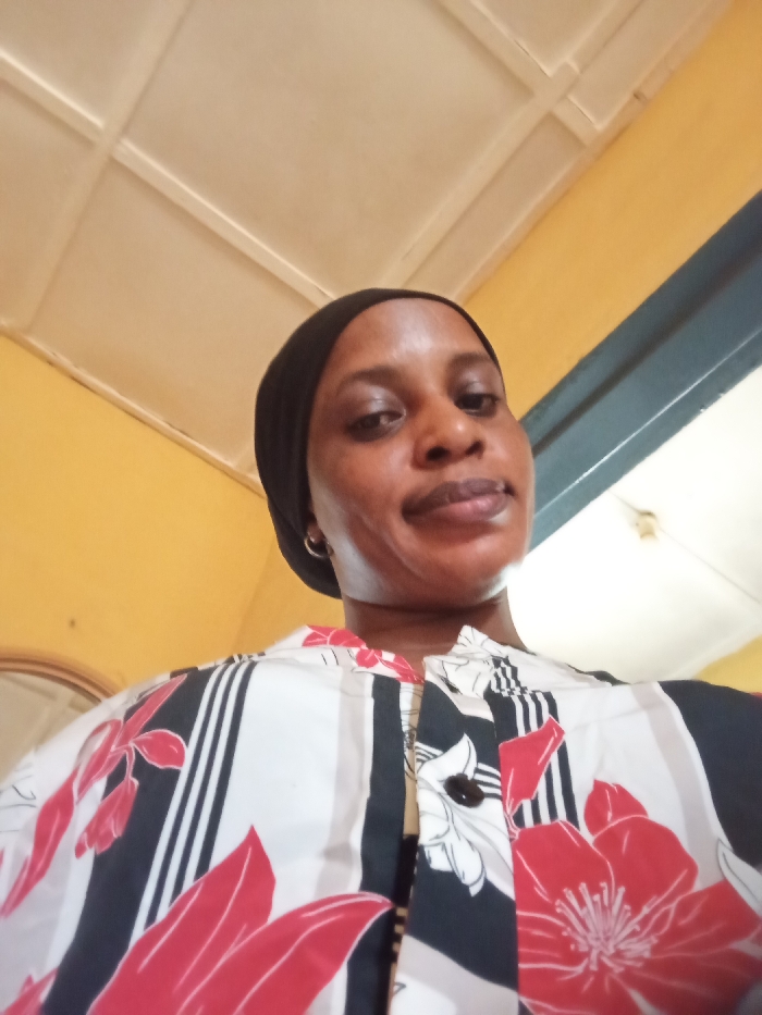An adult female is depicted indoors in Narayi, Nigeria, photographed from a low, upward angle