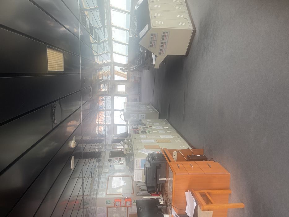 The image displays the interior of a vessel's bridge, potentially located near Orimedu, Nigeria. The space features a dark gray carpeted floor and a dark, reflective paneled ceiling with integrated circular and rectangular light fixtures and a central smoke detector. On the left, a light brown wooden desk with three drawers supports a black computer monitor and a black multi-function printer. Various papers are scattered on the desk and an adjacent wooden stool. Along the port side wall, a series of light-colored control consoles or cabinets are equipped with numerous panels, switches, and affixed documentation. Wall-mounted emergency equipment and diagrams are visible above and behind this console row. Towards the bow, another arrangement of light-colored control consoles, some featuring slanted top panels with indicators, fronts a panoramic array of large multi-pane windows. These windows offer a bright, hazy view of open water and sky; distant, indistinct elements are visible through the haze. An unidentifiable human silhouette is faintly visible in the far background, positioned between two forward control consoles. The scene appears static, with no active personnel or interactions observed.