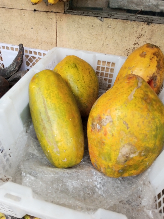 - "The scene, set in Pacet, Indonesia, displays four papayas contained within a white rectangular plastic crate" by FM-HWMWB2, licensed under CC BY 4.0