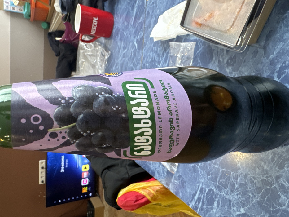 The image presents an indoor scene on a blue surface with a white marble-like pattern, identified as being located in Podolsk, Russia. A large plastic bottle of "BASILIANI LEMONADE WITH SAPERAVI AROMA" is the central subject, positioned upright. The bottle has a green cap, a dark-colored liquid, and a purple label depicting a cluster of dark grapes with small white circles suggesting bubbles. Text on the label is in Georgian and English. In the background to the left, a television screen displays a dark interface with white text that reads "Это КОСМОС" (This is SPACE/COSMOS), along with several colorful application icons visible at the bottom of the screen. A white power strip is mounted on a light brown wall above the television. A black garment is partially visible, with a yellow and red item tucked beneath it, to the left of the bottle. To the right of the bottle, a red ceramic mug bearing the "NESCAFÉ" logo is present. Behind the mug, a crumpled clear plastic material is visible. On the blue surface closer to the foreground on the right, a small, clear plastic packet, a crumpled white paper napkin, and a rectangular clear plastic food container with a brown base are arranged. The far-right background contains indistinct objects, some featuring orange and blue elements. No individuals, explicit actions, or direct interactions are depicted.
