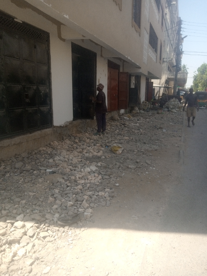 This image captures a street scene in Tudor ward, Kenya, under bright daylight. A multi-story building with a light-colored facade occupies the left side of the frame, its ground floor featuring several commercial entrances. The first two entrances from the foreground are secured by closed black metal rolling doors. The third and fourth entrances appear to have open brown wooden doors. The immediate foreground and the ground directly in front of the building are covered with significant amounts of construction rubble, fragmented concrete, and dirt. A male subject, wearing a dark short-sleeved shirt, dark trousers, and a patterned cap, stands facing the partially open second doorway from the left. He appears to be interacting with the door or its frame with his hands. A yellow object, possibly a bag, rests on the rubble near his feet, and a single grey shoe is visible among the debris closer to the camera. Further down the street on the right, a second male subject, dressed in a dark t-shirt and light-colored shorts, walks away from the camera. A utility pole laden with numerous overhead wires is visible on the right side of the street, extending into the background. A light-colored vehicle is partially discernible in the far distance. The overall environment suggests an urban area undergoing some form of construction or renovation activity.