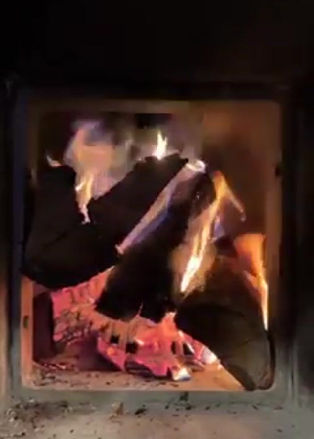 square opening of a wood burning stove or fireplace filled with burning pieces of wood