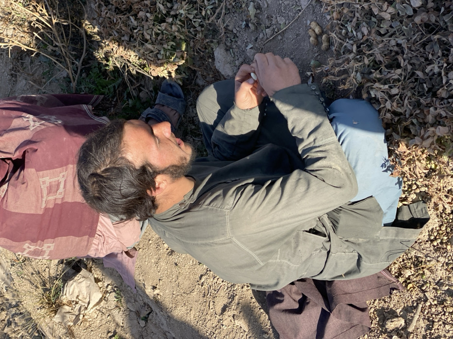 An overhead shot shows a man seated on the ground in an outdoor setting. He has dark hair and a beard, wearing a green jacket, blue pants, and a single sandal. A maroon and pink patterned cloth lies beside him. He is manipulating a small white object in his hands, seemingly engaged in a meticulous task. The ground surrounding him is a mix of dirt, small rocks, and scattered dry foliage. Strong shadows indicate a sunny day.