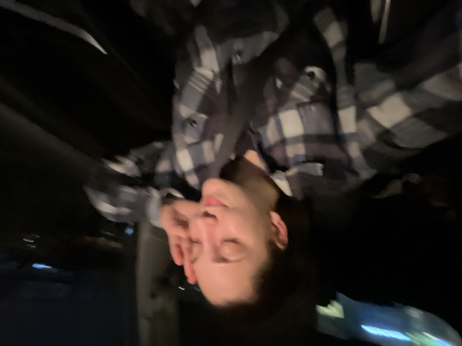 A person wearing a plaid shirt is shown upside down, with eyes closed and hand near their face. The background is dark, seemingly at night, with some blurred lights suggesting an outdoor setting, possibly a car interior or adjacent street. The overall image has a blurred quality, suggesting motion or a low-light condition.