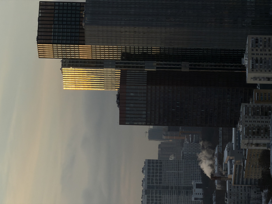The image depicts an urban cityscape in Khimki, Russia, viewed from an elevated perspective, likely at either sunrise or sunset. The sky above is partially cloudy, transitioning from a pale yellow-orange tint on the left to a muted grey-blue on the right. The scene is dominated by multiple high-rise buildings and skyscrapers. On the central-right, a tall, slender skyscraper features a facade intensely illuminated by direct sunlight, presenting a golden-yellow reflective surface with prominent vertical elements. To its immediate right and slightly behind it, two taller, dark-colored skyscrapers stand mostly in shadow, each displaying a grid pattern of windows across their facades. A fourth, blockier, dark-colored skyscraper with a reddish-brown upper section is positioned to the lower-left of the brightly lit building. In the mid-ground, towards the left of the frame, several modern multi-story residential buildings are visible, characterized by lighter grey or white facades and repeating window layouts. Further in the distance, obscured by atmospheric haze, additional taller structures and what appears to be a construction crane can be faintly distinguished. The lower portion of the image reveals a dense concentration of older, lower-rise residential or commercial buildings, typically 3-5 stories high, with varying facade colors including beige and grey. Many of these buildings have flat or gently sloped roofs, some exhibiting a light dusting of snow. A distinct chimney in the lower-mid-ground emits a visible plume of white smoke or steam, rising vertically before dispersing horizontally to the right. No individuals, specific actions, or interactions are discernible within the frame. The primary subjects are the architectural structures and the atmospheric conditions.