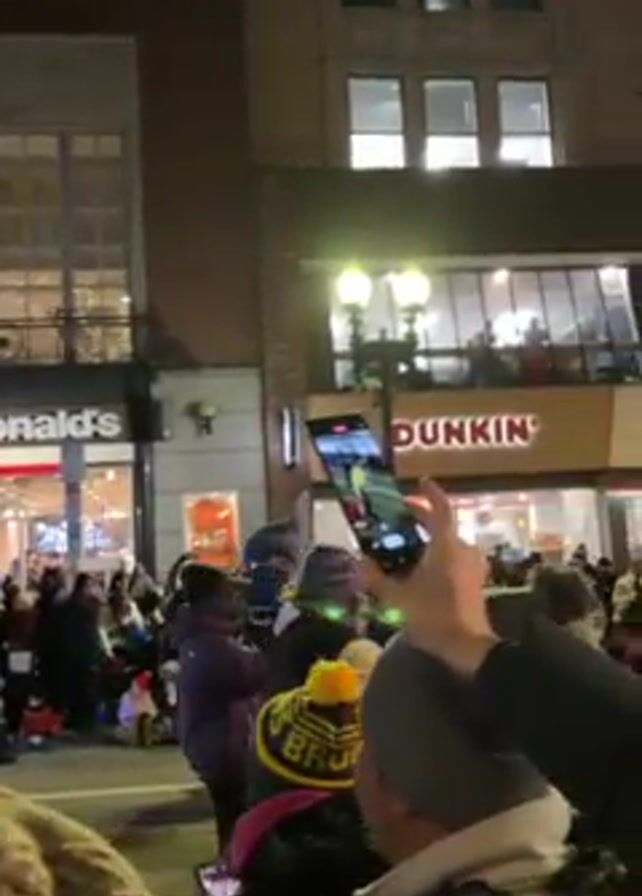 street parade at night, with a brass band playing music. The band consists of at least one trumpet player and one trombone player. The crowd of spectators is bundled up in winter clothing and some are filming the parade on their cell phones. In the background, there are buildings with lighted signs for McDonald's and Dunkin'. Traffic lights are visible at the intersection.