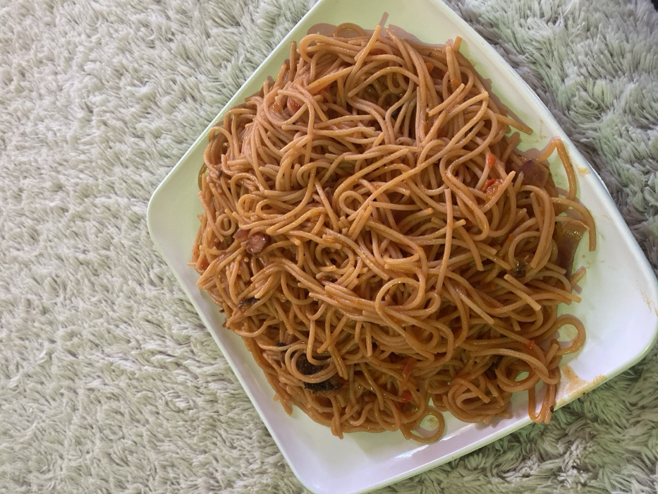 - "A square white plate is piled high with spaghetti covered in a reddish-brown sauce" by FM-jZXWt2, licensed under CC BY 4.0