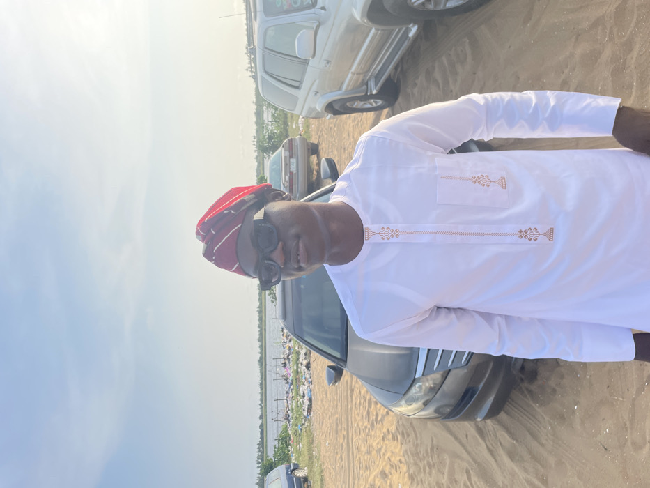 An individual in a white traditional outfit with brown detailing and a red and white striped cap stands next to a gray car on sandy ground. The person is wearing sunglasses. In the background, there are several parked cars and a body of water with what appears to be trash along the shoreline. The sky is partially cloudy.