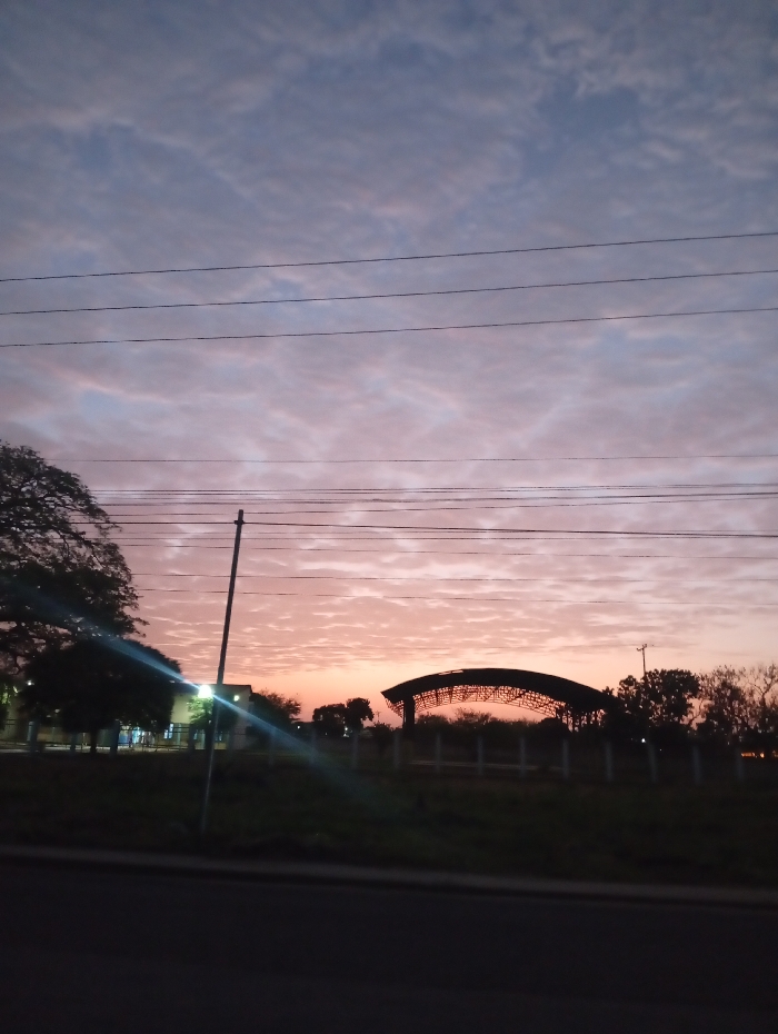 The image depicts an urban landscape in Valencia, Venezuela, during twilight, characterized by the distinct arch structure of the Estadio José Bernardo Pérez. The sky, transitioning from light blue at the zenith to vivid pink and orange hues near the horizon, is populated by numerous altocumulus clouds. Multiple dark utility lines traverse the upper and middle sections of the frame horizontally. In the foreground, a dark asphalt road surface extends across the bottom. A utility pole stands vertically in the left-center, from which a bright, artificial light source emanates, creating a visible lens flare. To the left, a large tree and the dark silhouettes of several indistinct buildings are present. The prominent feature in the midground, positioned right of center, is the silhouetted, arched, open-framework roof of the grandstand belonging to the Estadio José Bernardo Pérez. Additional silhouetted vegetation and a fence line are visible in front of the stadium structure. The scene is devoid of discernible human activity or moving vehicles.