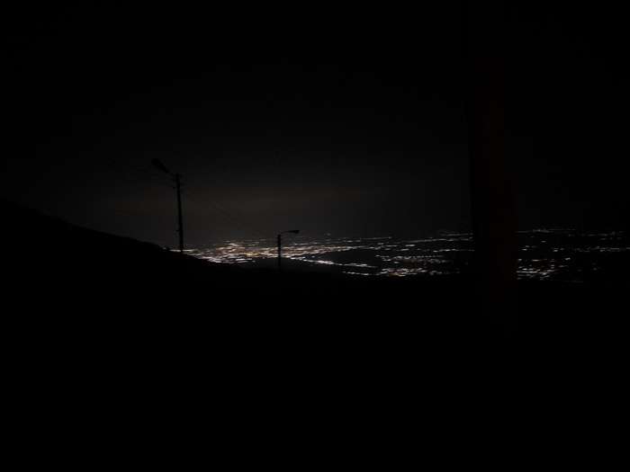 The image displays a nighttime, elevated view overlooking the city of Yavrovo, Bulgaria. A dark, silhouetted hillside occupies the lower left portion of the frame. Two dark utility poles, each equipped with a street light fixture, are visible in the midground, silhouetted against the distant urban lights. The city of Yavrovo in the background presents a wide expanse of numerous white and yellow light clusters, indicating illuminated buildings and infrastructure. The night sky is dark, exhibiting a subtle atmospheric glow directly above the city lights. A dark, vertical object is partially visible along the extreme right edge of the frame. No individuals or direct actions are discernible.