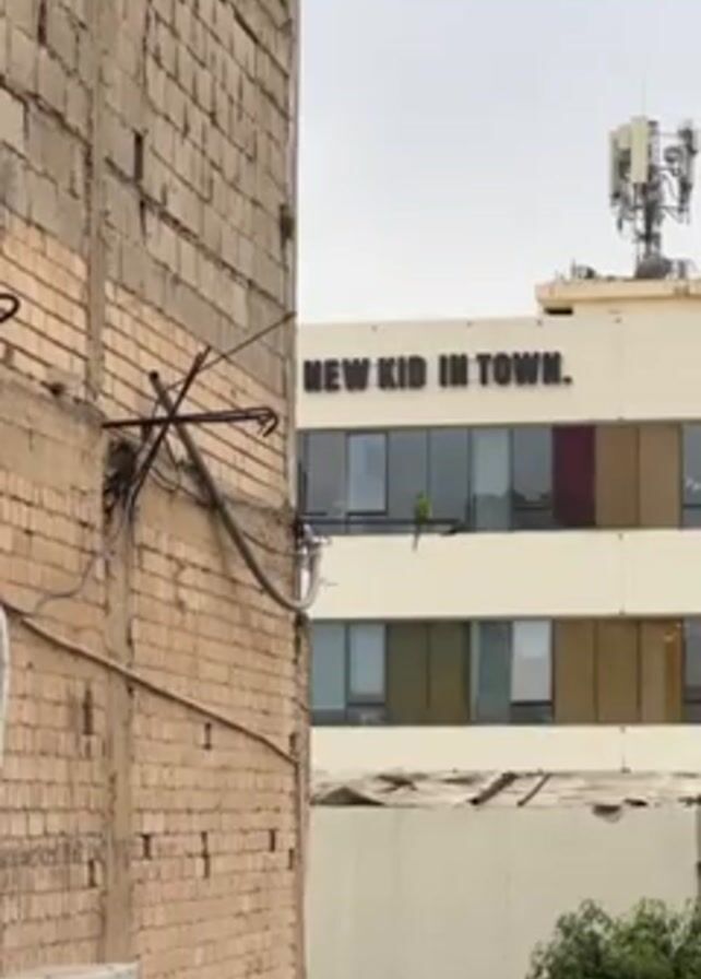 green parrot perched on a metal rod outside a building. In the background is another building with the words "NEW KID IN TOWN." written on it in black letters. There is also a cell tower atop the background building. The video is shot from between two buildings. The building on the left has an air conditioning unit attached.