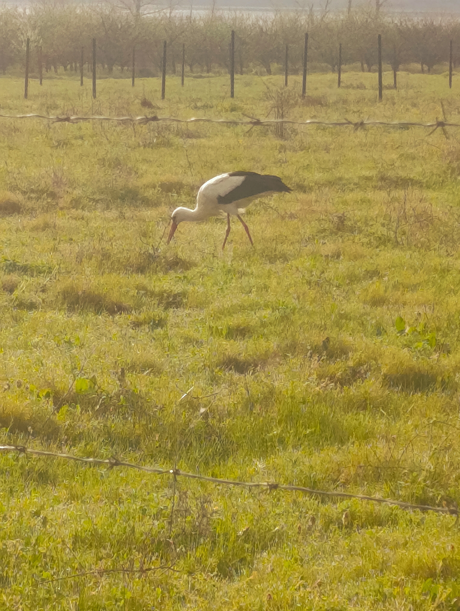 A white stork with black markings is foraging in a grassy field. A barbed wire fence runs across the middle ground of the image, and a line of trees or bushes is visible in the background. The environment appears to be rural, with an open field and trees, but the specific location is unknown.