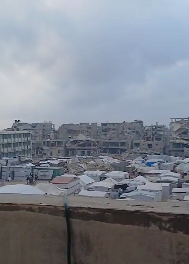 The video presents a view from an elevated position, likely a rooftop, overlooking a city landscape exhibiting signs of significant damage and destruction. Buildings in the middle ground appear heavily damaged, with visible structural damage, including collapsed sections and debris. In the foreground, there are numerous white structures, potentially tents or temporary shelters, suggesting a displaced population. The sky is overcast, contributing to the somber and desolate atmosphere. There are a few individuals and a vehicle visible amidst the rubble, suggesting the presence of people within the damaged area.