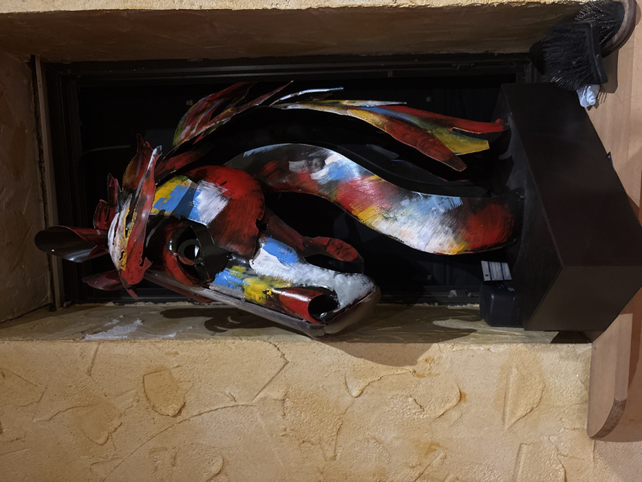 A vibrant, abstract metal sculpture resembling a horse head rests inside a fireplace alcove