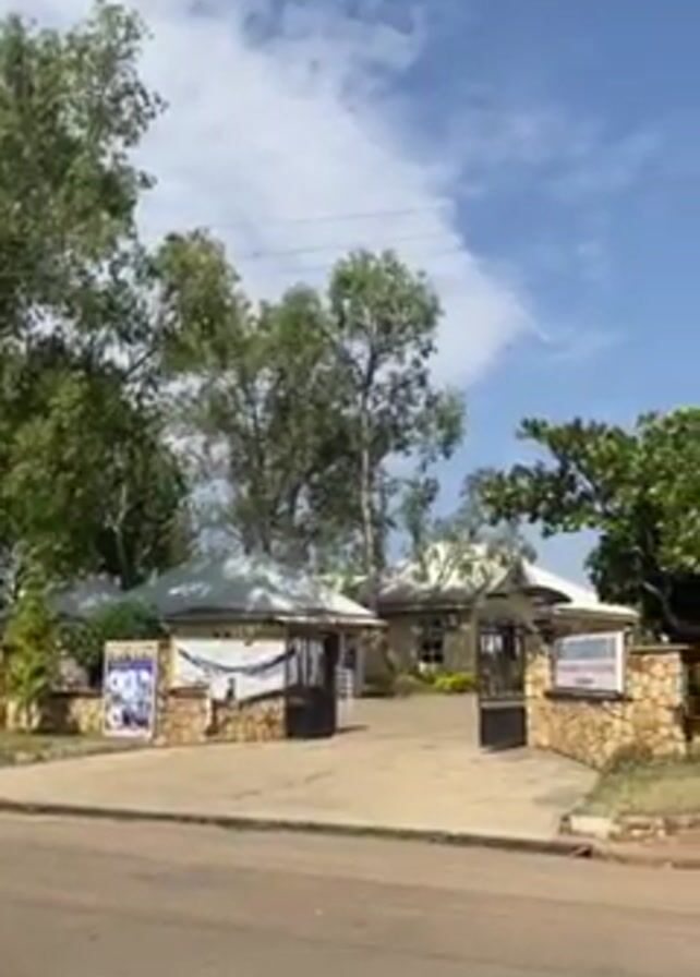 street view in an urban area. In the first shot, we see a building with a gated entrance. The building is surrounded by trees. The next shot shows a residential building with a blue roof. A light blue sedan drives past the house. The sky is clear and blue with a few white clouds.