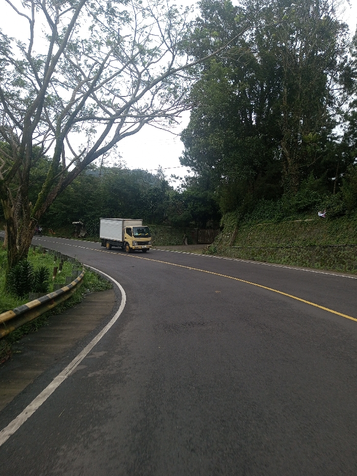 The scene depicts a daytime view of a paved two-lane road in Ariyalai, Sri Lanka, curving to the right from the foreground. The asphalt road features a solid yellow centerline and a white edge line along its left shoulder. A light-colored box truck, with a tan or yellow cab and a white cargo compartment, travels on the right lane, moving away from the viewer towards the curve. To the left of the road, a black and yellow striped guardrail follows the curve, separating the roadway from an area of green vegetation and small shrubs. A large, deciduous tree with extensive, bare branches dominates the upper left quadrant, its canopy reaching high against an overcast sky. Further back on the left, partially obscured by foliage, a dark-colored two-wheeled vehicle is visible. To the right of the road, dense green foliage and tall trees form a natural barrier. Below the trees, a retaining wall, appearing to be stone or concrete and covered with green vegetation, supports an elevated embankment. A small white sign with red lettering is partially visible on this wall, partially obscured by greenery. No individuals are clearly visible in the immediate vicinity.