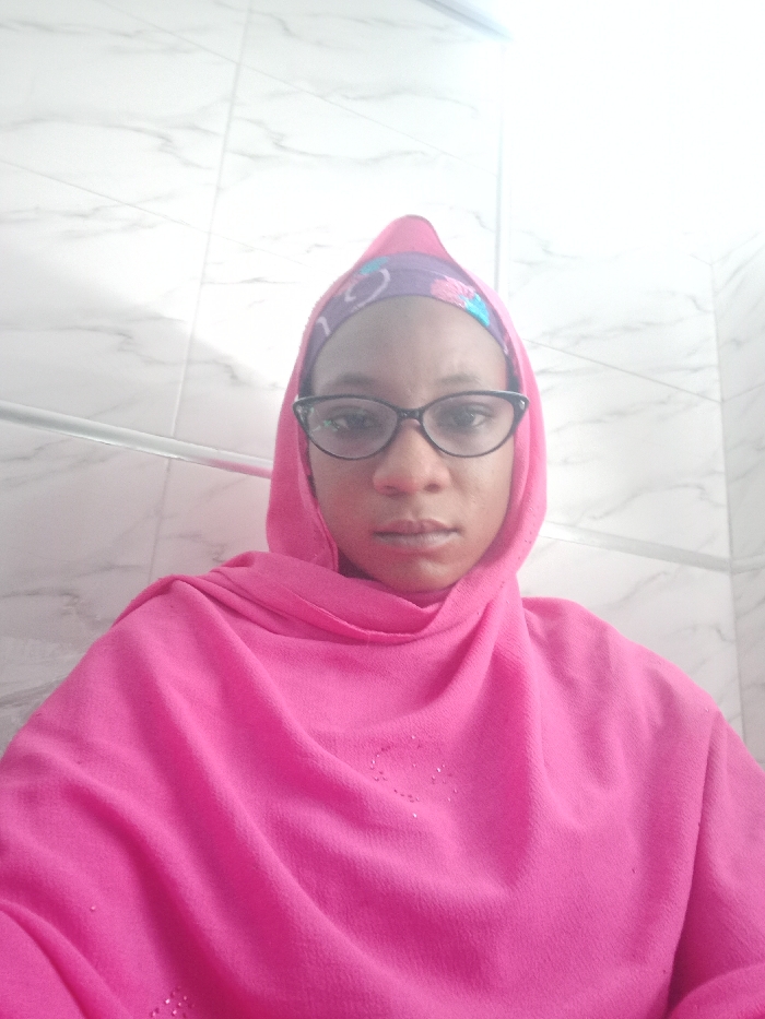 An image displays a single individual, appearing female, positioned centrally and facing directly forward. The individual wears a bright pink hijab, draped over the head and shoulders, covering the lower portion of the face. A patterned purple headband, featuring lighter colored motifs, is visible on the forehead beneath the pink hijab. Black-framed, cat-eye style eyeglasses are worn. Small, shiny embellishments are sparsely distributed on the pink fabric, notably on the chest area. The background consists of white tiled walls exhibiting a subtle grey marble-like veining. A horizontal metallic bar is visible across the upper left to middle left of the background. The lighting is bright, illuminating the scene from the front. The environment is consistent with an indoor room featuring tiled walls. The specific location within the city of Tarauni, Nigeria, cannot be determined from the visual content of the image.